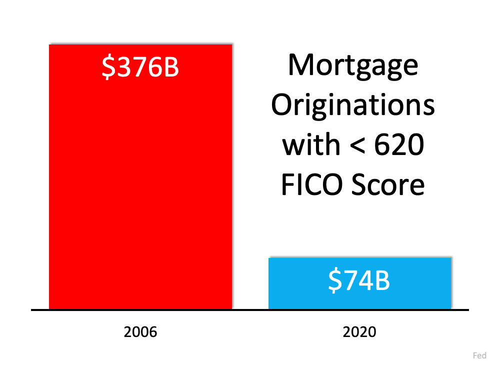 Back in 2006, nearly everyone could qualify for a loan. The Mortgage Credit Availability Index (MCAI) from the Mortgage Bankers’ Association is an indicator of the availability of mortgage money. The higher the index, the easier it is to obtain a mortgage. The MCAI more than doubled from 2004 (378) to 2006 (869). Today, the index stands at 130. As an example of the difference between today and 2006, let’s look at the volume of mortgages that originated when a buyer had less than a 620 credit score.
