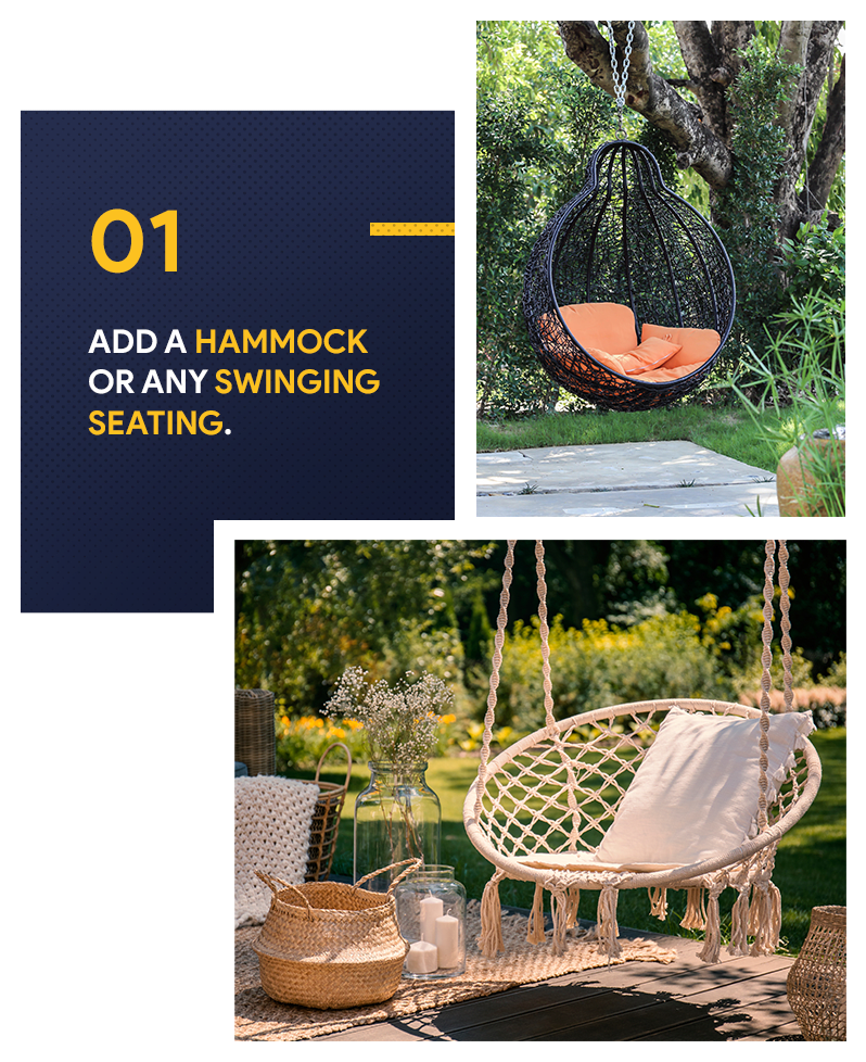 A hammock or any swinging chair is a simple way to update your backyard. They take up less space, and there are plenty of designs and styles to choose from that will work in almost any setting. It's also a great choice if you want to achieve that beachy vibe using a decorative accessory. Whether you put it on your porch, terrace, or patio, a hammock’s easy swinging motion is calming and it can be a relaxing way to end your day.