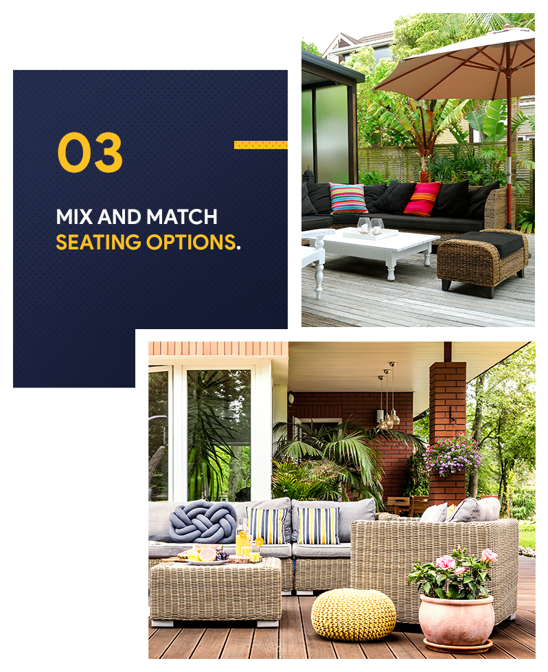According to Zillow's 2019 Outdoor Living Trends, there's no need to rely on matching patio sets to upgrade your space. Instead, you can mix and match your seating options to achieve that curated, eclectic look that continues to gain popularity. Pull together benches, chairs, pint-sized stools, and ottoman for a unique look. You can even add floor pillows and poufs to create extra seating in your lounge area because, who doesn’t love that lovely Bohemian feel?