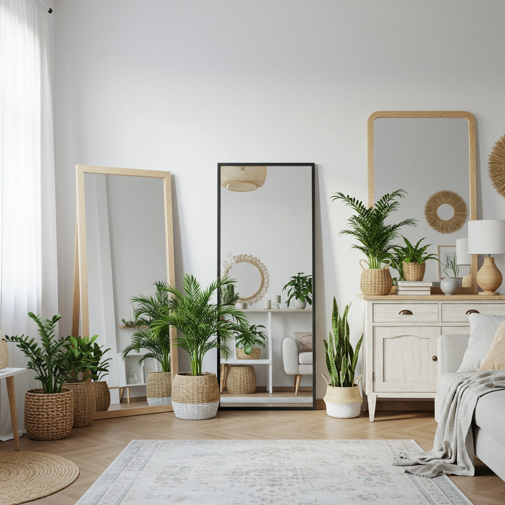 Mirrors can make a room look larger and feel more open. However, large mirrors can at times be distracting. To counterbalance the effect, place a few tiny plants or cute topiaries in front of it. You can use plant pots or containers that match the color of your mirror frame for a more harmonious effect.