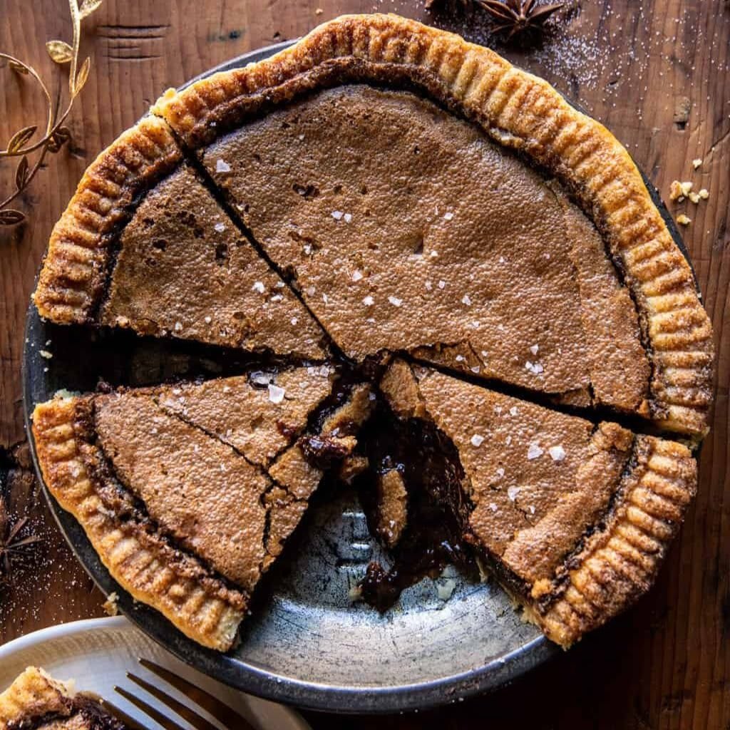 The best ever Brown Sugar Maple Cookie Pie. A super simple pie made with browned butter, brown sugar, maple, eggs, and plenty of chocolate. All baked together until puffed on top, but gooey in the center. The crust is buttery, flaky, and sprinkled with sweet vanilla sugar. Inside the filling is warm with pockets of melted chocolate, notes of maple, brown sugar, and vanilla. Delicious when served with a dollop of vanilla whipped cream. It’s the perfect Thanksgiving pie…or maybe just the perfect Friday night dessert!