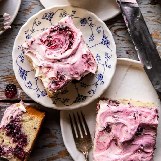 Keeping this sweet, simple, and delicious with this Swirled Blackberry Lavender Sheet Cake. Light and fluffy vanilla cake swirled with homemade blackberry lavender jam. Then generously frosted a sweet vanilla bean white chocolate buttercream. This cake is nothing short of delicious. Every bite is layered with fresh berries, hints of lavender, and sweet vanilla cake. The perfect berry-filled cake for any and all occasions.