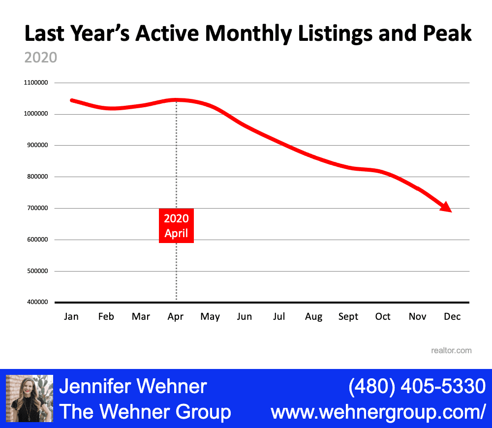 Last year, the trend was different. Historical seasonality wasn’t repeated in 2020 since many homeowners held off on putting their houses up for sale because of the pandemic (see graph below). In 2020, active listings peaked in April, and then fell off dramatically for the remainder of the year.
