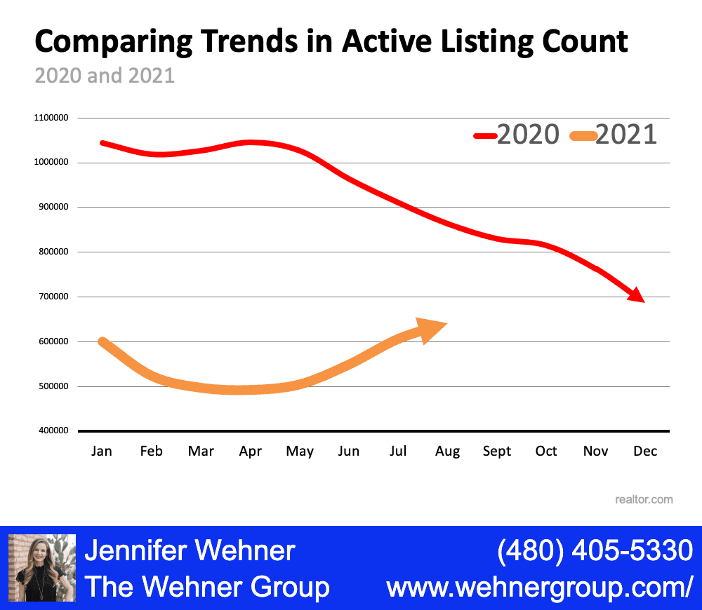 Due to the decline of active listings in 2020, 2021 began with record-low housing inventory counts. However, we’ve been building inventory over the last several months as more listings come to the market (see graph below):