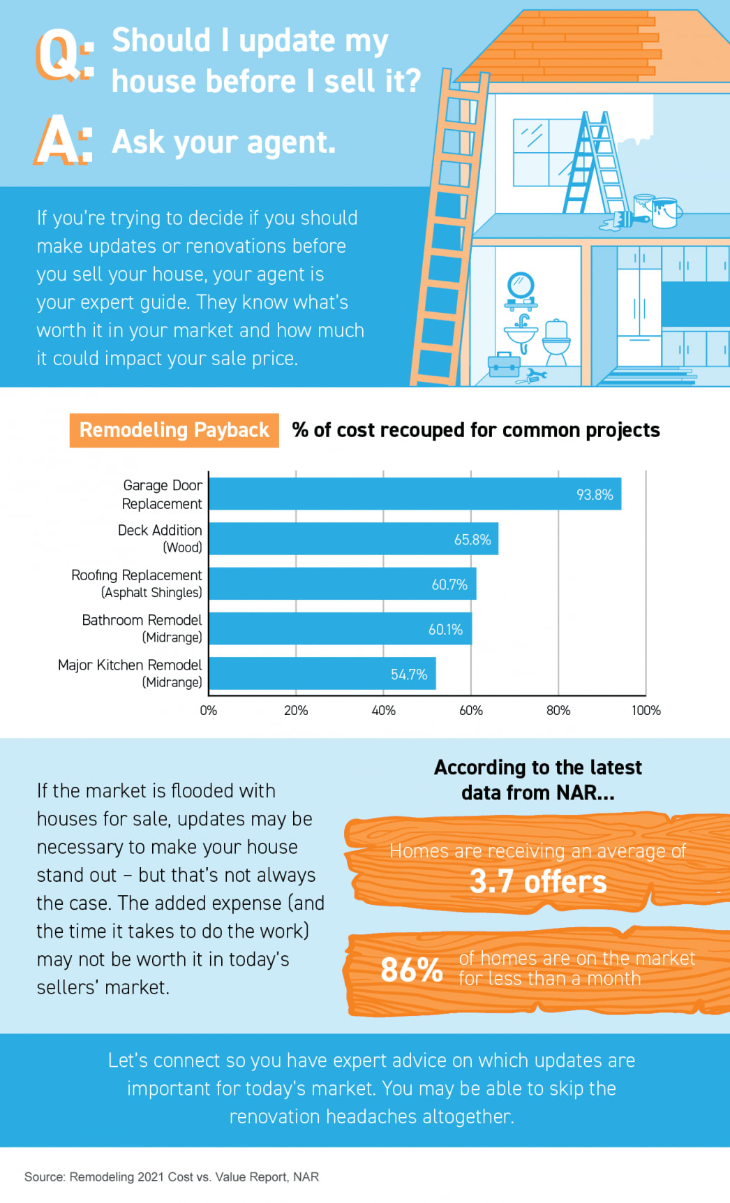 If you’re deciding whether you should make updates before you sell your house, lean on your agent to be your guide. If the market is flooded with houses for sale, updates may be necessary for your house to stand out. In our current sellers’ market, the added expenses might not be worth it. Let’s connect so you have expert advice on which updates are important in today’s market.
