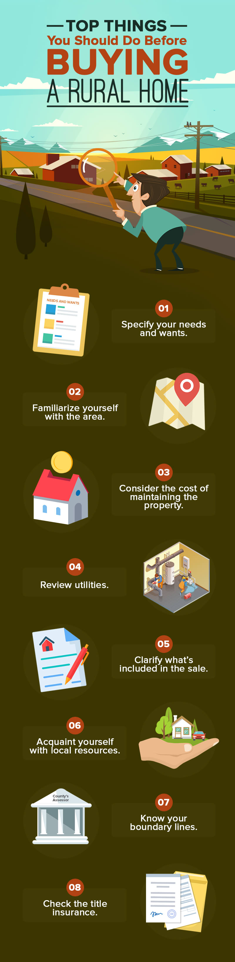 Before you plan to buy a home in a rural area, it’s best for you to check with yourself what your reasons for buying are. What are you going to make out of this property? Are you using it as a vacation home or a primary residence? Are you going to use the land for agricultural purposes? Do you need your lot to be arable? One way to do this is to make a list of what you need and want your living conditions to be. Include your non-negotiable conditions and nice-to-haves. What you put into this list will help you narrow down the rural areas and properties that would suit you, and would also be of useful information to your real estate agent.